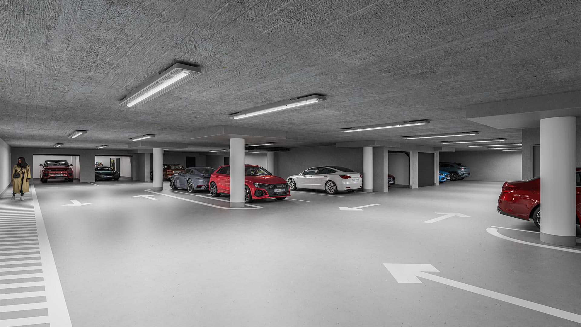 Undir húsunum er tvöfaldur bílakjallari með fjölda einkabílastæða. Er kjallarinn búinn rafstýrðri hurð með bílnúmerastýringu, öryggismyndavélum og hreyfiskynjurum. Aðgangsstýring tryggir að aðeins viðurkenndir notendur komist að.