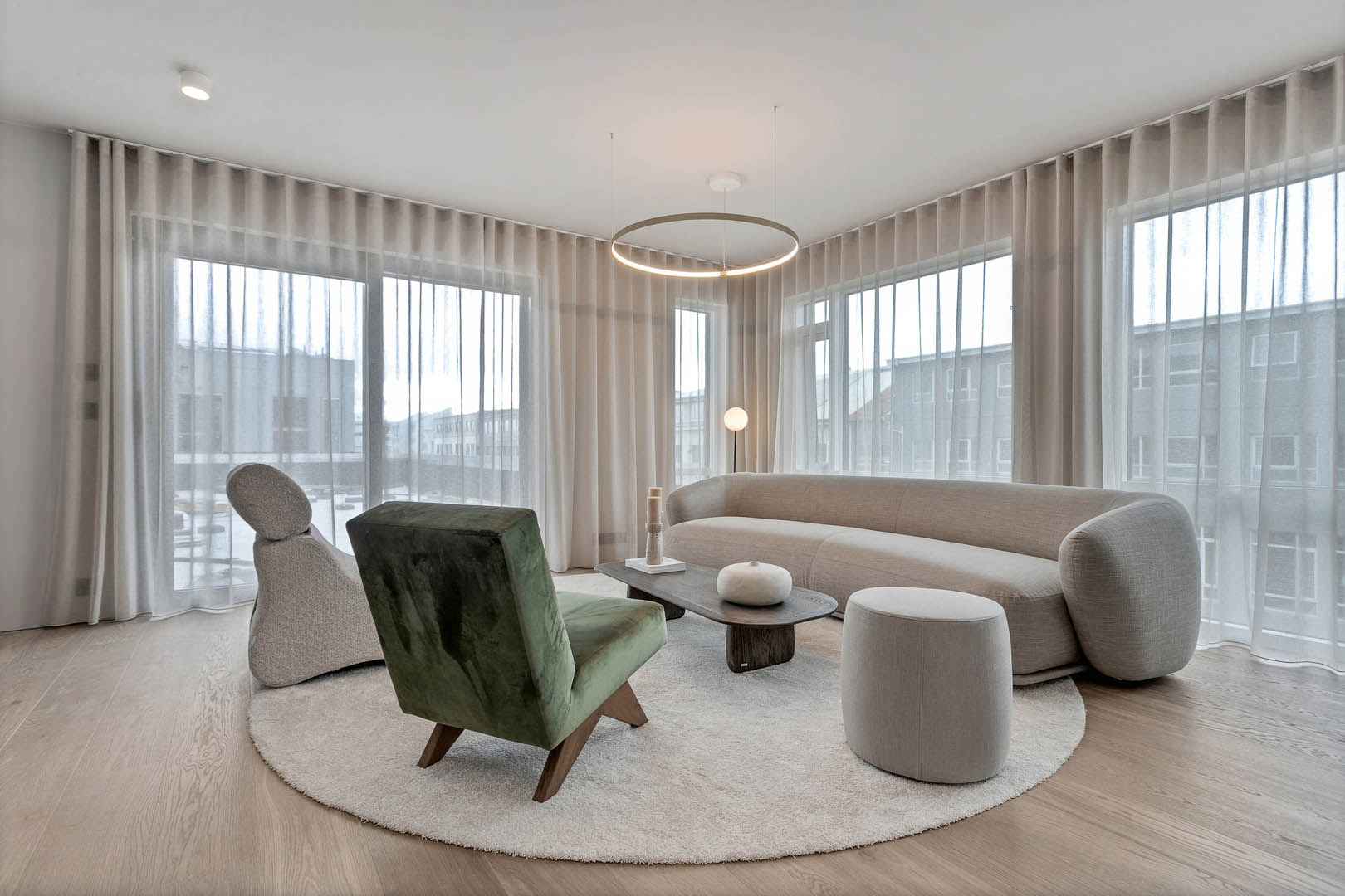 Gott skipulag og gæði voru höfð að leiðarljósi við hönnun íbúðanna. Gólfsíðir gluggar sem einnig ná hærra til lofts hámarka flæði birtu inn í íbúðina en um leið hámarka útsýni frá. Gólfhiti er í öllum íbúðum.